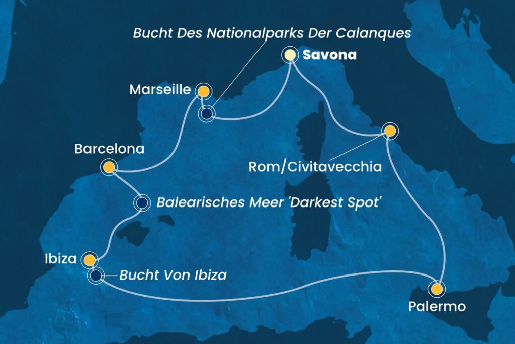 Ihre Reise auf dem Mittelmeer beginnt in Savona. Die Stadt an der Riviera, drittgrößte in Ligurien, war schon früh besiedelt. Nahe der heutigen Stadt lag das Dorf der Sabatier, ihr antiker Name war Savo. Die Altstadt lädt zum Verweilen und Entdecken ein und wer es sich lieber in der Umgebung des sehr modernen Kreuzfahrtterminals gemütlich machen möchte, ist herzlich eingeladen sich in eines der vielen schönen Cafés zu setzen und den Blick auf den Hafen zu genießen. Ihr Schiff legt um 18 Uhr ab.